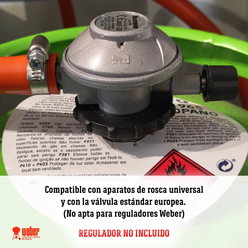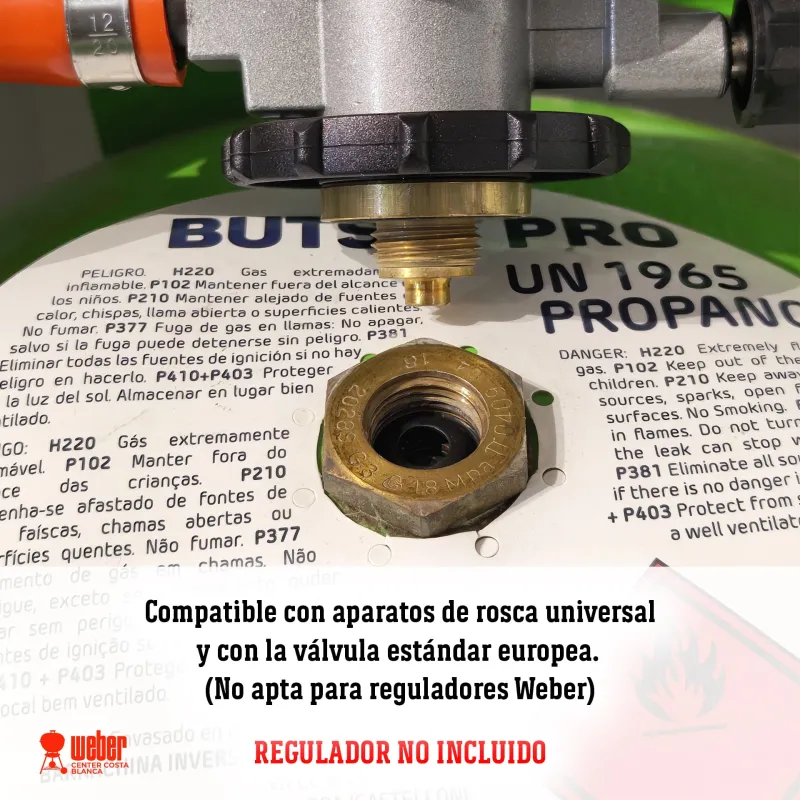 Compatible con aparatos de rosca universal y con la válvula estándar europea. (No apta para reguladores Weber)
