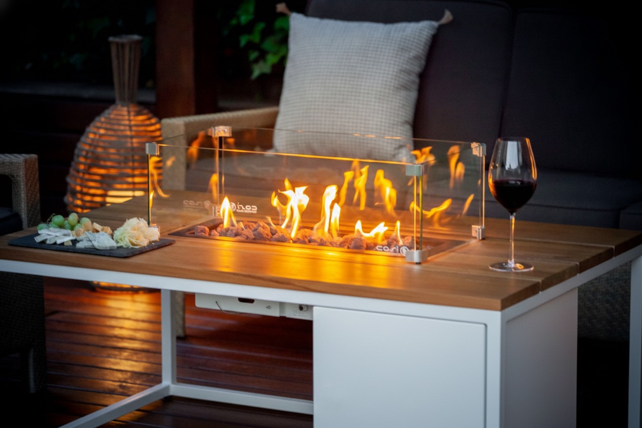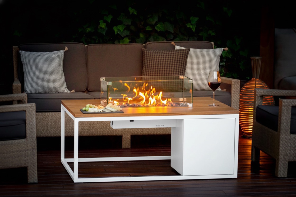 La mesa Cosiloft 120 redefine las veladas al aire libre con su fuego lineal y elegante, convirtiéndose en el punto focal perfecto para cualquier espacio exterior.