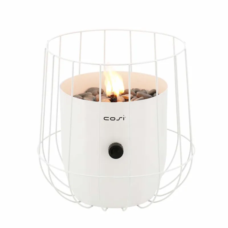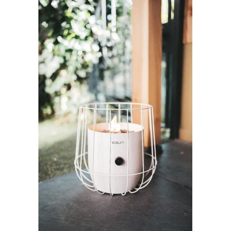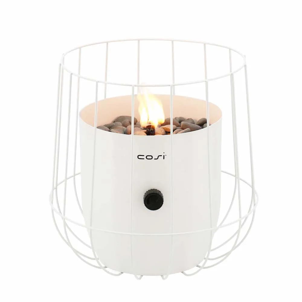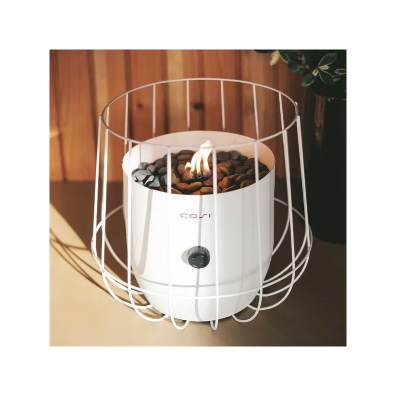 Fuego decorativo con llama vista Butsir Cosiscoop Basket fabricado en metal pintado de blanco, indicado para uso exterior. Incluye cristal piedras decorativas, regulador de temperatura y malla metálica que aporta un diseño único y protege de la llama.