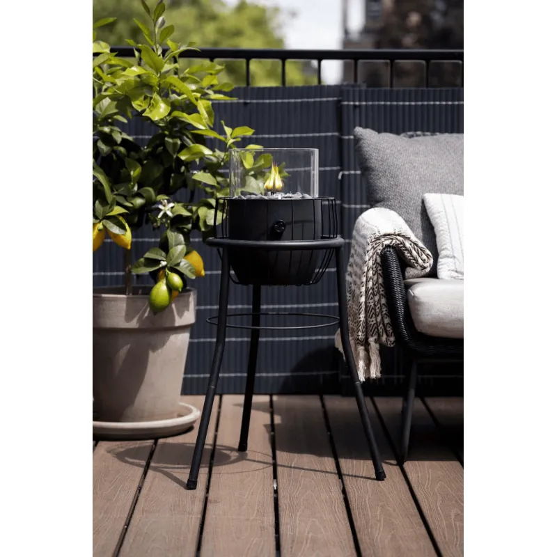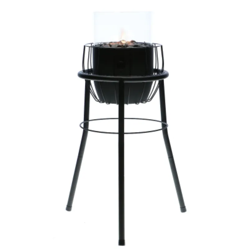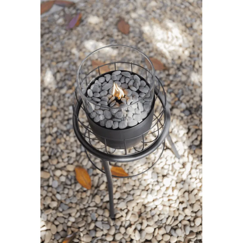 Fuego decorativo con llama vista Butsir Cosiscoop Basket High fabricado en metal pintado de negro, indicado para uso exterior. Incluye cristal piedras decorativas, regulador de temperatura y un cristal protector que aporta un diseño único y protege de la llama.