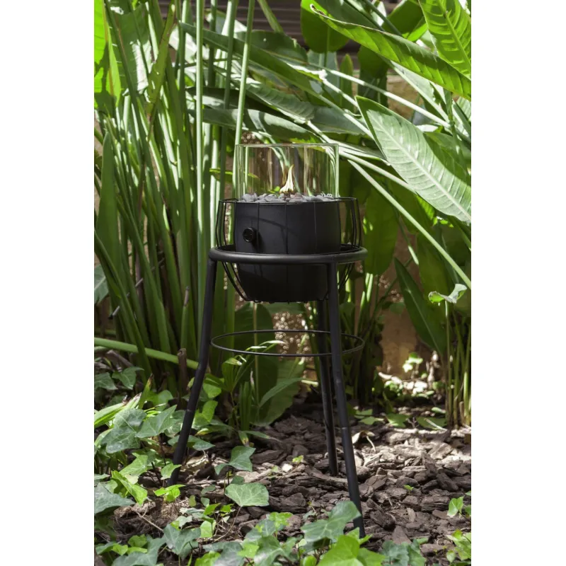 El modelo de farol a gas Cosiscoop Basket High, con su peana, es perfecto para crear ambientes, destacar zonas y alumbrar accesos o escaleras. Una excelente solución para iluminar en eventos, hoteles y restaurantes. Su estructura es ligera, de metal tratado para exteriores, y está disponible en color negro. Homologado para interiores y exteriores.